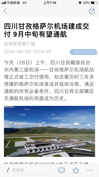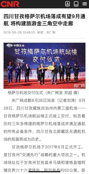 四川觀察:http://kscgc.sctv.com/sctv/lookback/1/2019/08/28/20190828_shared.html?programmeUrl=http://fscgc.sctv.com/NewsTV/2019/08/28/scxw20190828002.mp4&programmeTitle=%E7%94%98%E5%AD%9C%E6%A0%BC%E8%90%A8%E5%B0%94%E6%9C%BA%E5%9C%BA%E8%90%BD%E6%88%90%E4%BA%A4%E4%BB%98%20%E6%9C%89%E6%9C%9B9%E6%9C%88%E9%80%9A%E8%88%AA&programmeImage=http://kscgc.sctv.com/sctv/1/image/public/201908/20190828184902_tjee6skhpc.jpg