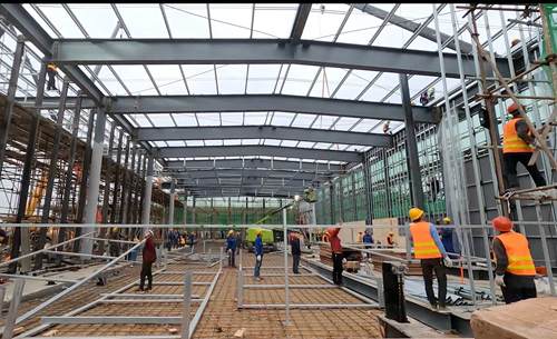 第1天,場(chǎng)地土方平整、柱基開挖、鋼結(jié)構(gòu)預(yù)埋螺栓、柱基砼澆筑完成;第2天,地坪混凝土澆筑完成;第4天,鋼結(jié)構(gòu)主體270噸吊裝完成;第5天,室內(nèi)轉(zhuǎn)換鋼架及內(nèi)外墻龍骨焊接完成,內(nèi)外裝修全面展開;第7天,2300平方米屋面彩瓦鋪設(shè)完成;第11天,幕墻全部完成;第13天,內(nèi)外裝修、PC板鋪裝、以及PC花崗石鋪裝完成……看著13天平地起高臺(tái)的速度和成績,項(xiàng)目指揮長王成軍激動(dòng)地說:“大家擰成一股繩,不回家、不下線、不松勁,很多管理人員甚至連續(xù)兩天不睡覺盯現(xiàn)場(chǎng),可謂一小時(shí)也不耽誤,一小時(shí)也不懈??!業(yè)主都夸我們是善打硬仗、‘無所不能’的五冶人!”