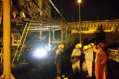 7月7日,沙鋼焦化一車(chē)間外的高壓電纜橋架因被吊車(chē)撞擊,立柱、橋架全部倒塌,電纜、水管、蒸汽管道等摔落在廠區(qū)道路上,其中部分電纜電壓高達(dá)10000V,嚴(yán)重威脅著人員、設(shè)備、車(chē)輛安全。同時(shí),該橋架上的電纜直接影響到焦?fàn)t、除塵風(fēng)機(jī)、水熄焦泵的用電。五冶集團(tuán)上海有限檢修公司在不影響生產(chǎn)的情況下對(duì)電纜橋架帶電修復(fù)。