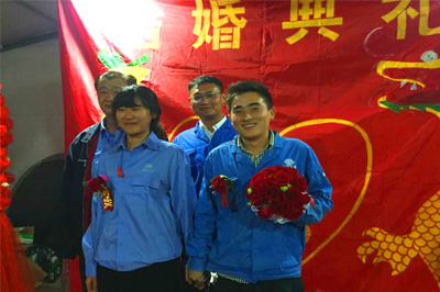 5月28日,青島即墨項(xiàng)目部建筑一線的陳曉東與妻子李海燕因工期緊、任務(wù)重,沒有時(shí)間回老家舉辦婚禮,同事們?cè)诠さ貫樗麄兣e辦了這場(chǎng)特別婚禮,項(xiàng)目部還為新人布置了婚房,雖然是工地上的活動(dòng)板房,但婚房在大紅喜字、彩帶的裝扮下,顯得非常溫馨喜慶。